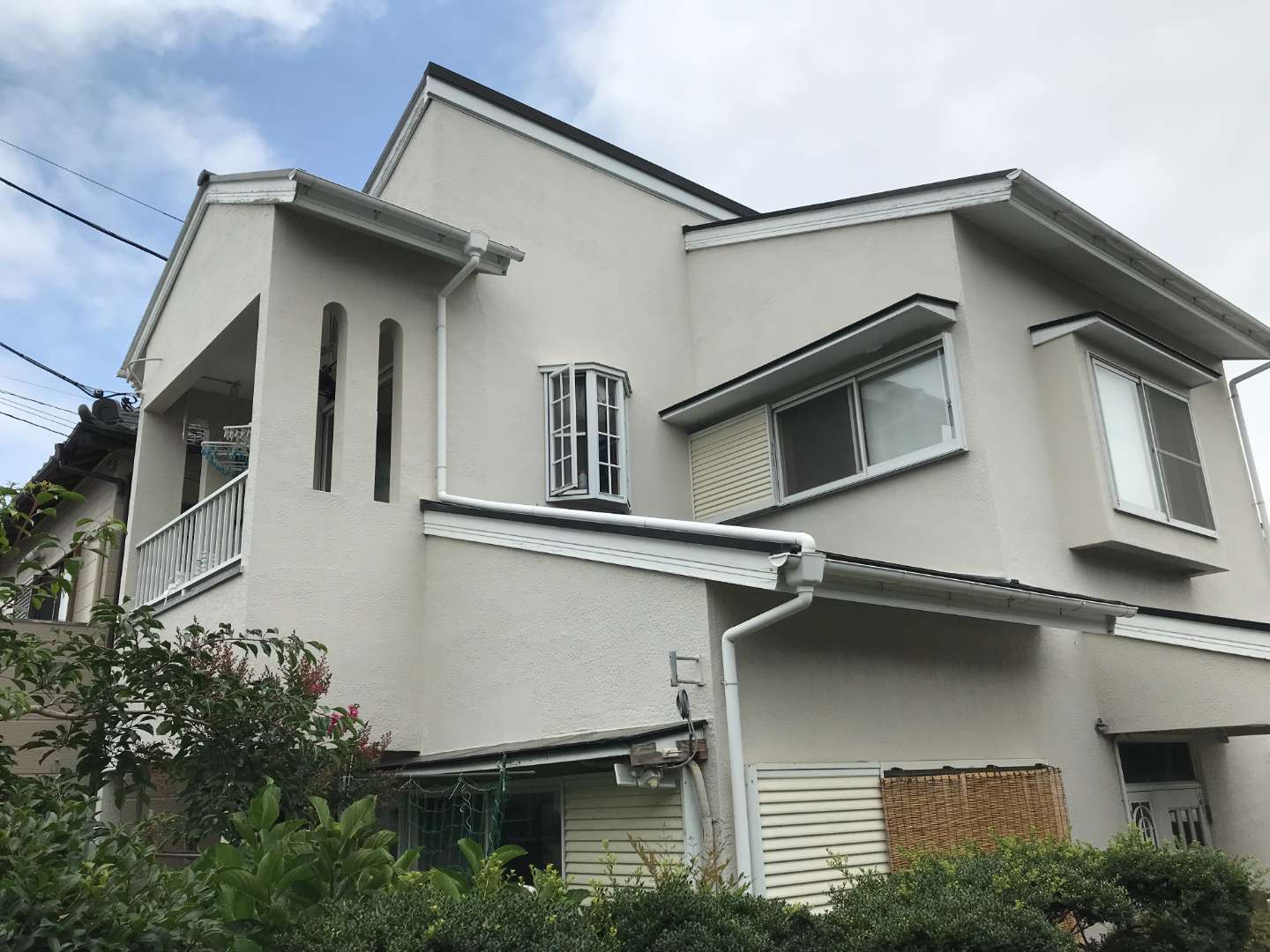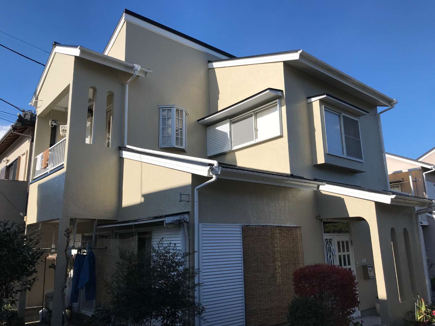 長年の紫外線や雨風によって色褪せたブルー系の外壁を、明るいアイボリーへ塗り替えました。サッシや雨樋などの付帯部はシックなダークブラウンで仕…